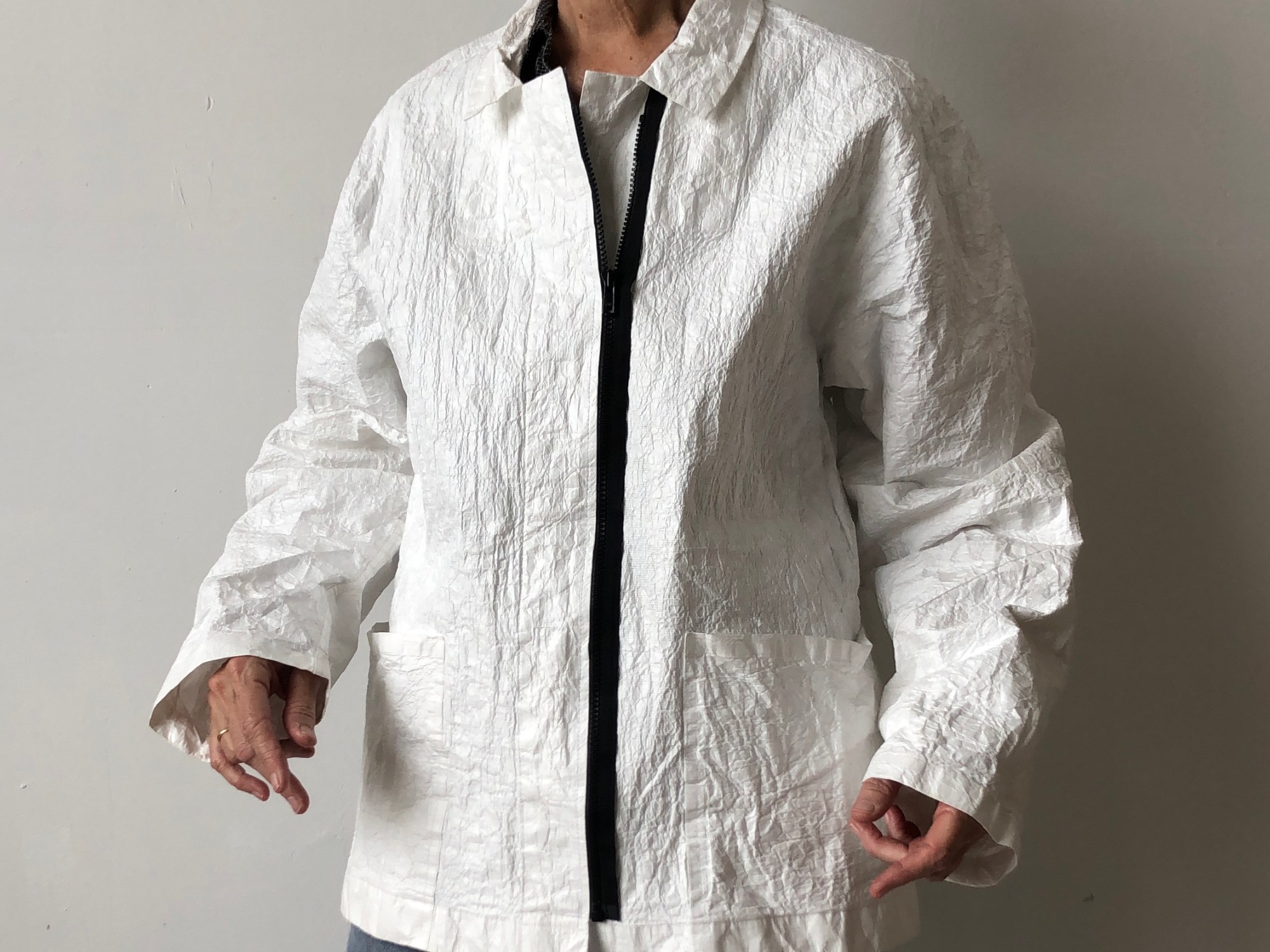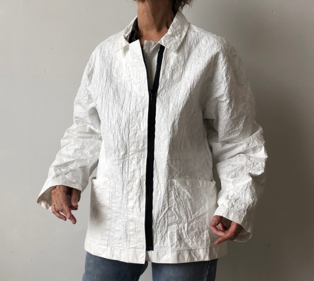 February 12, 2015August 23, 2025 Textured Shirt Jacket 8 available (5m and 3l) Tyvek Work Jacket laminated onto a reinforced webbing for texture and strength – available with black or red plastic zipper – inside pocket. looks great on women and men. 5 medium, 3 large $400.
