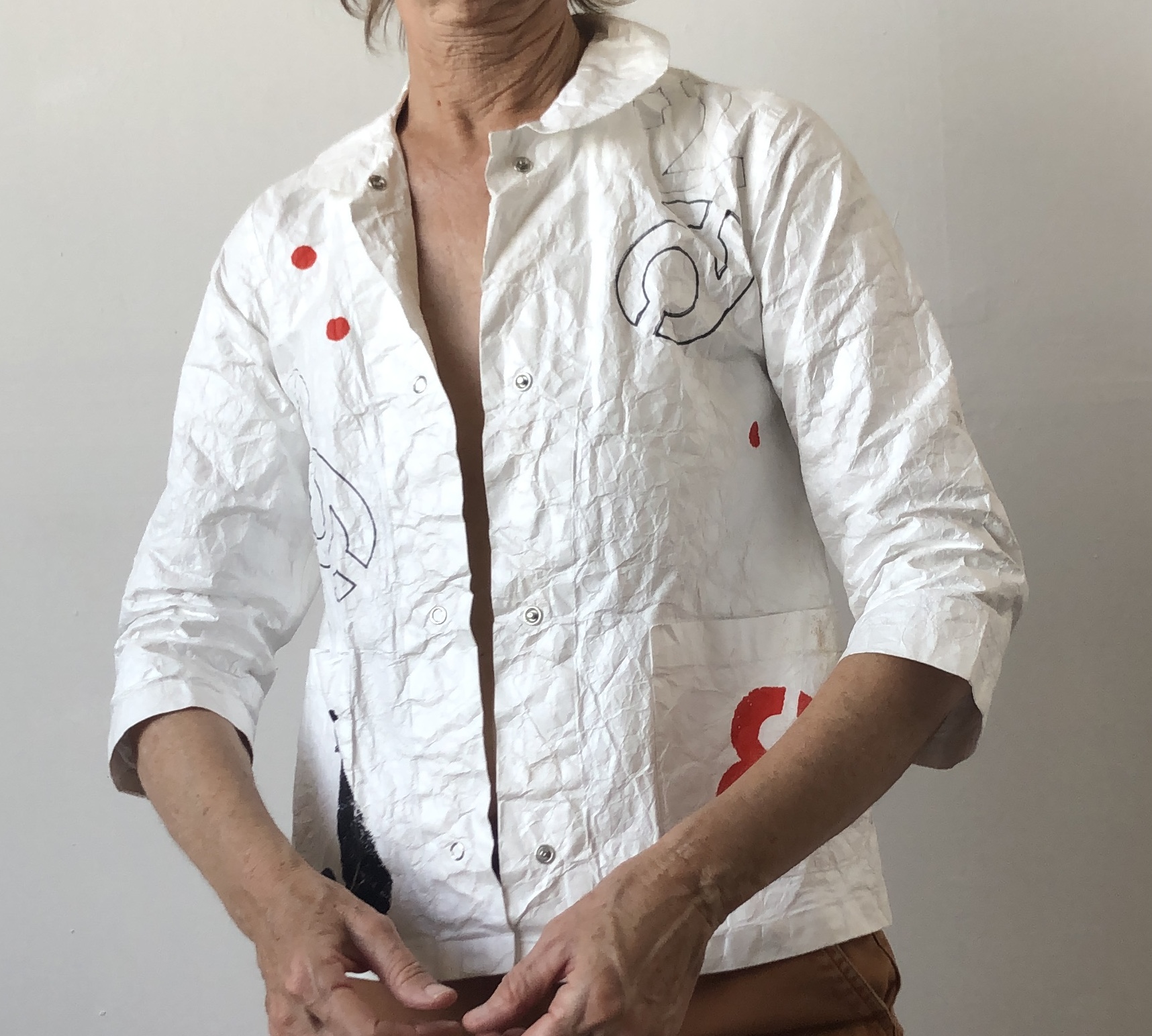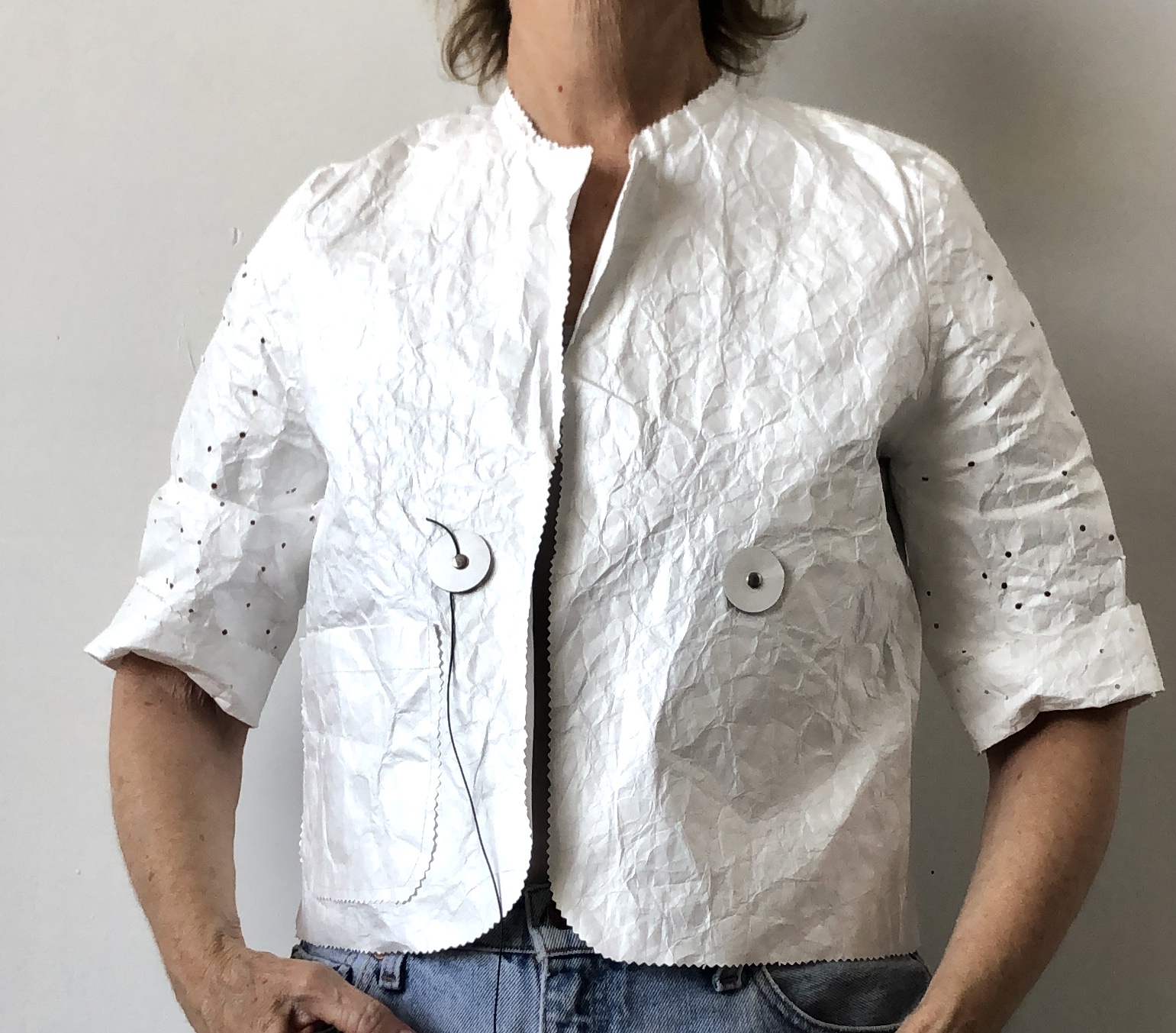 February 13, 2015August 26, 2025 Unique petite top – available (1 XS, 1small, 1 m) Close fitting tops Short top with pinked edges (size m petite ) and unique stenciling $470. Snug top with finished edges with collar one of a kind $470. size Xsmall petite Cropped top with hole punches and button string closure – size small $300.